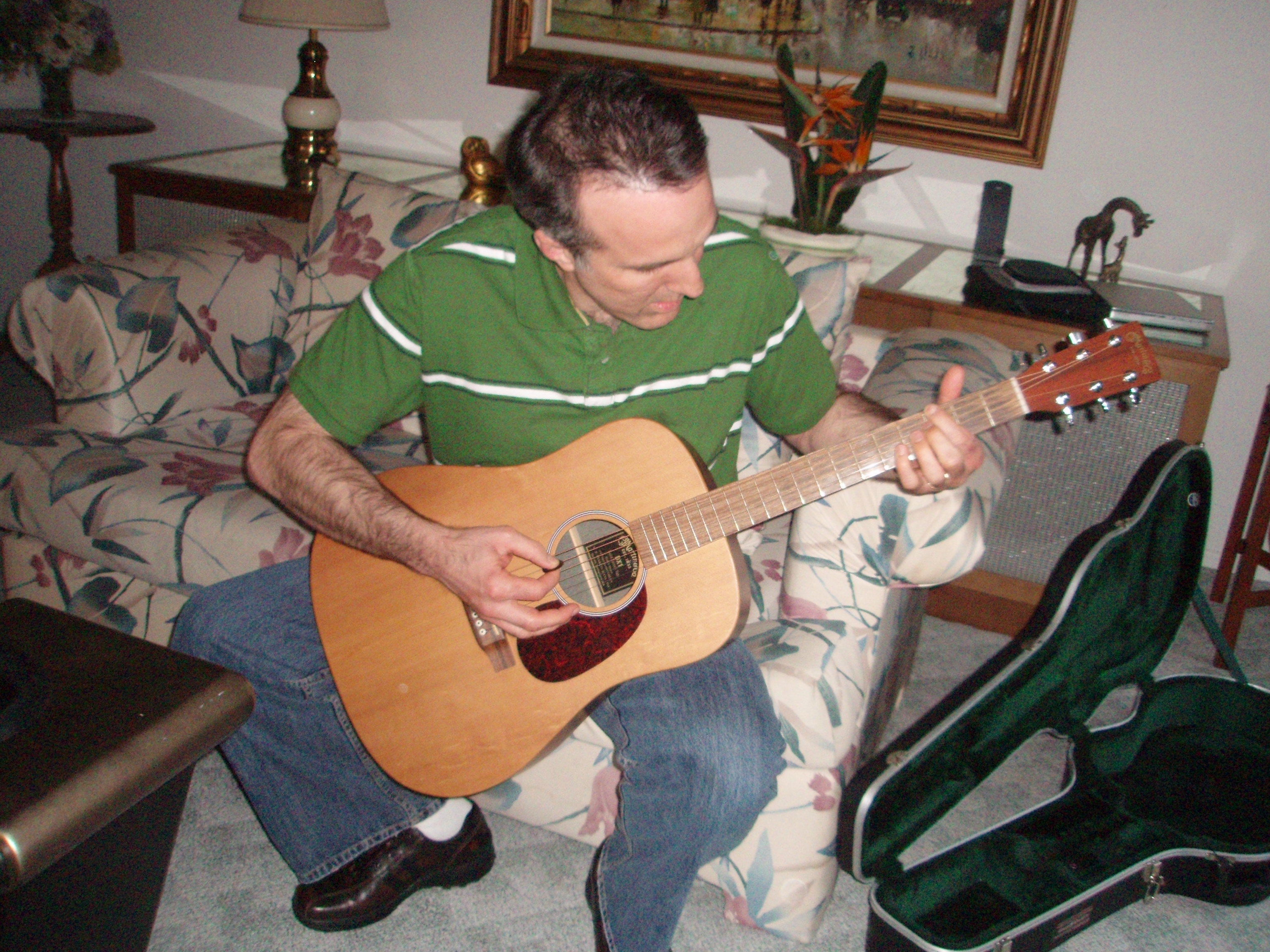 Scott, who usually plays an electric guitar, tries out Frank's acoustical
