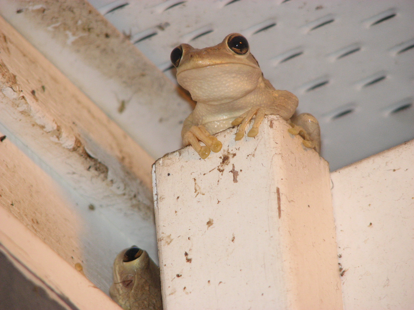they landed due to their sticky toes. The baby frog was between the wall and the sign and seemed a little more wobbly when leaping for his dinner. Too cute!